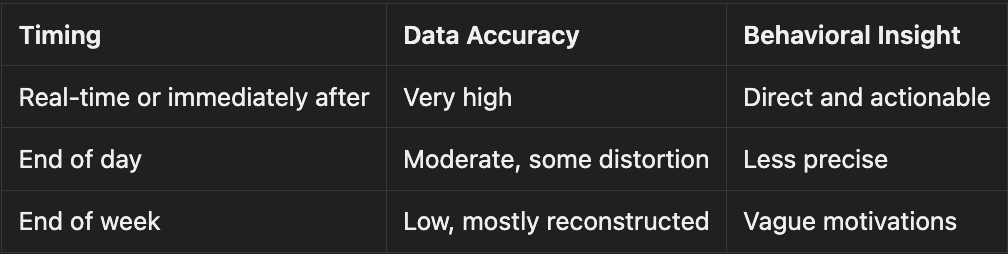 Gedächtnisforschungen zeigen, dass die Erinnerungsfähigkeit innerhalb der ersten Stunde nach einem Ereignis drastisch abnimmt. Wenn du das Aufschreiben zu lange hinauszögerst, werden deine Notizen zu einer rekonstruierten Darstellung und nicht mehr zu ehrlichen Aufzeichnungen. Das selektive Gedächtnis beginnt bereits damit, das Ereignis zu verfälschen, noch bevor es überhaupt niedergeschrieben wurde.