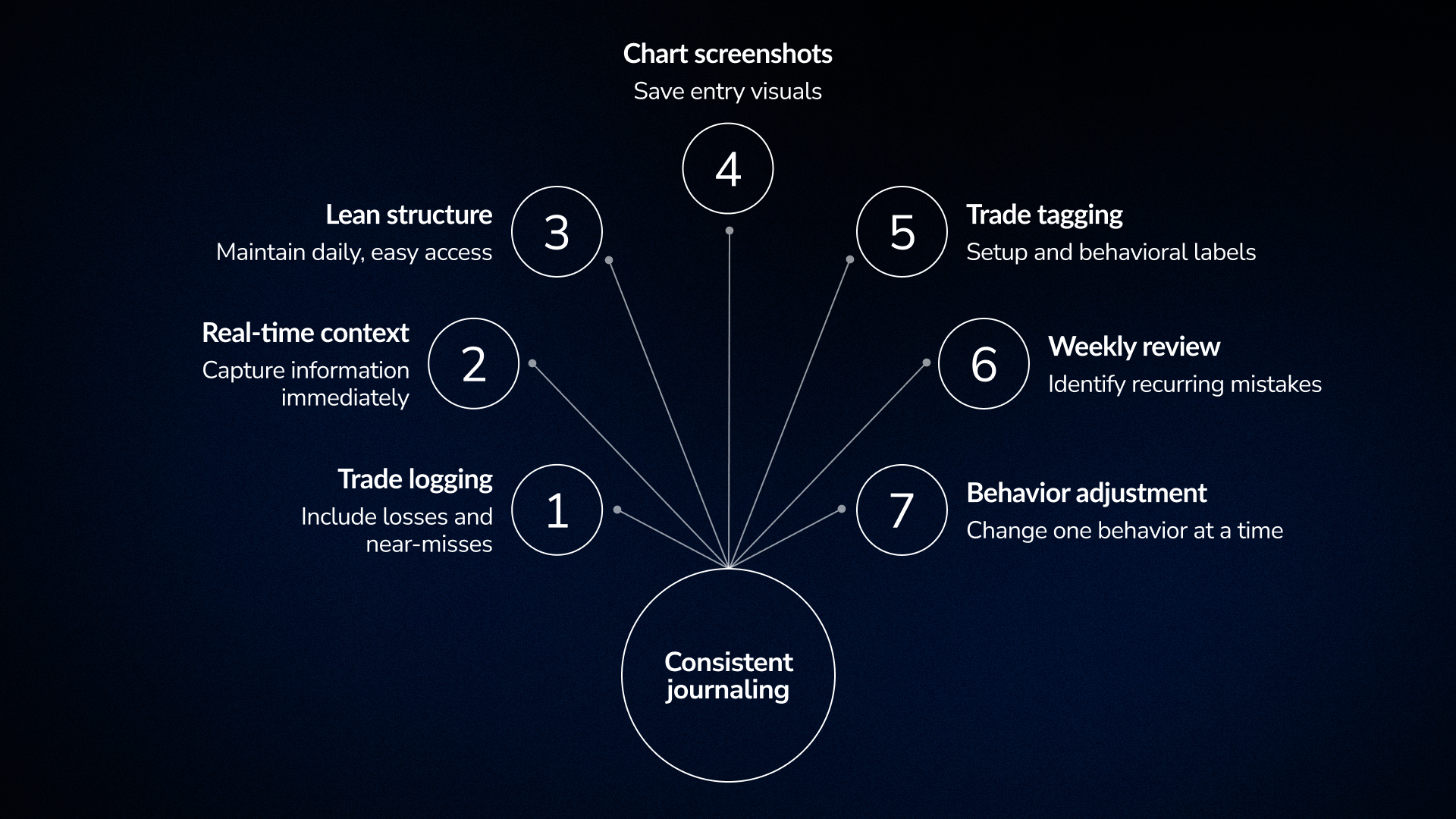 Das Speichern eines Chart-Screenshots beim Einstieg und optional auch beim Ausstieg bewahrt den visuellen Kontext, der die Handelsanalyse aussagekräftig macht. Ohne diesen Kontext lautet ein Tagebucheintrag lediglich „Breakout-Einstieg, Momentum-Setup“, und bei der Analyse muss man versuchen, sich aus dem Gedächtnis zu rekonstruieren, wie der Markt tatsächlich aussah.