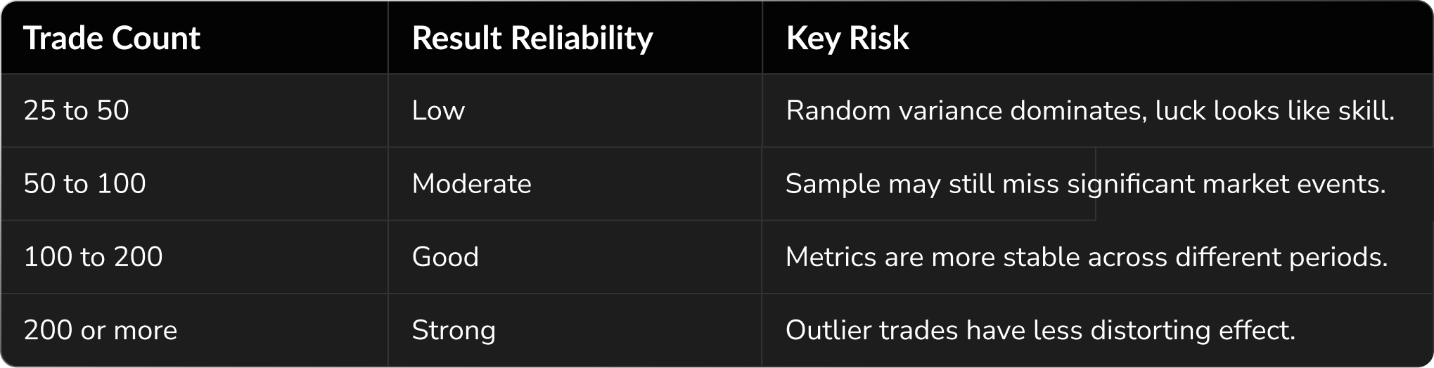 Random variance dominates results in samples of fewer than 100 trades. A 30-trade test with a high win rate does not prove a strategy has a long-term edge.