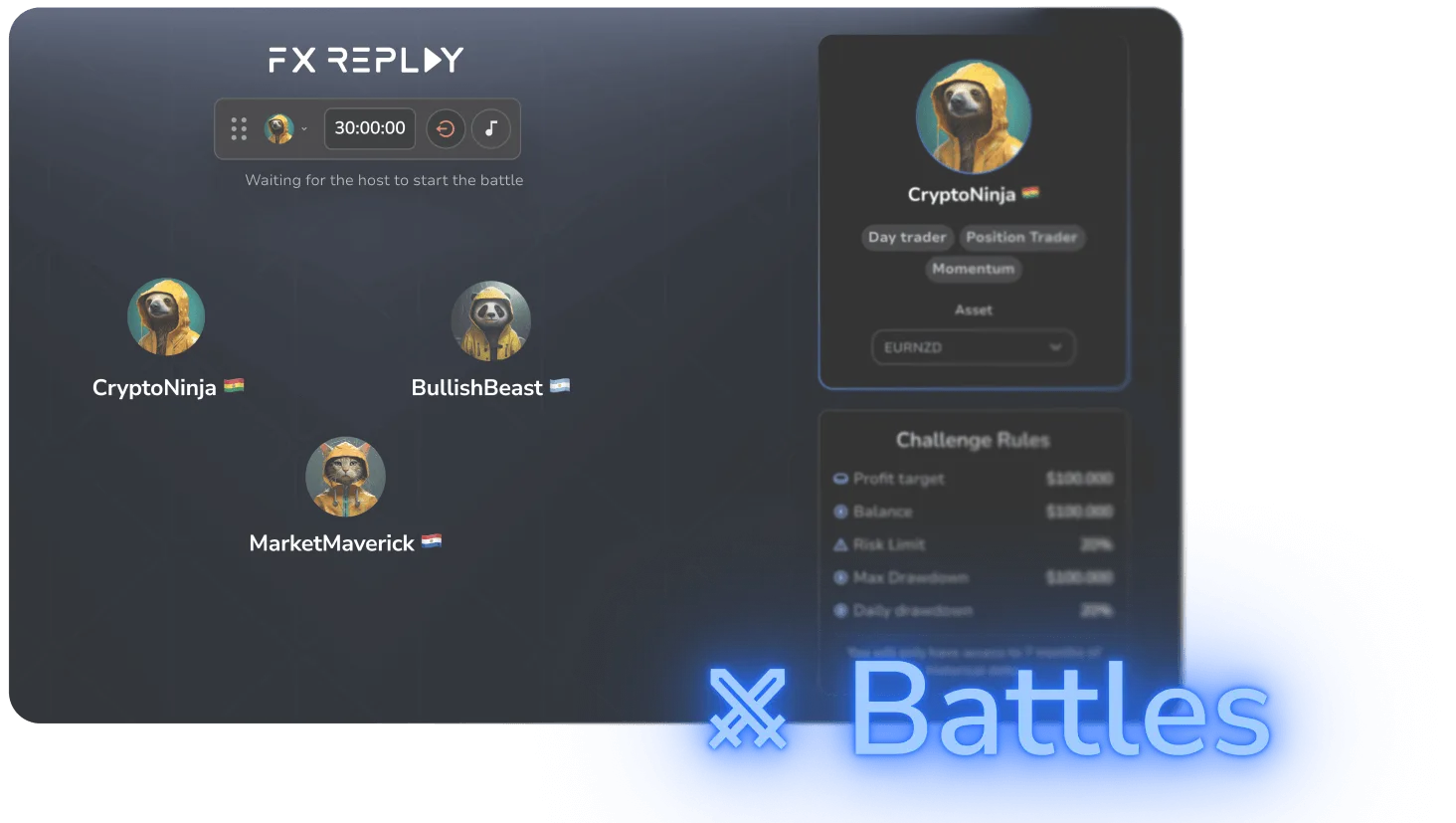 FXR Battles is where traders practice and compete with intensity—before risking real capital. Trade against others in real time. Sharpen your edge. Rise through the ranks.