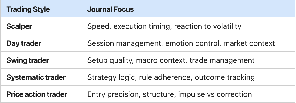 Start by identifying your strategy type (scalping, swing, etc.) and the key variables that influence your decisions. Build your journal around those inputs—not someone else’s system.