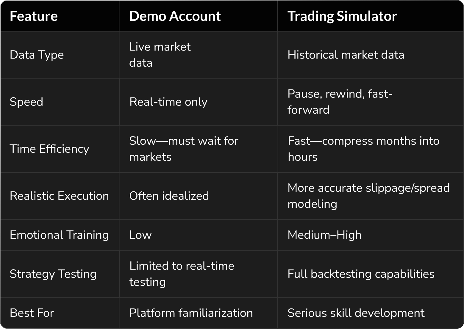 In short: demo accounts let you experience the market; simulators let you train in it.
