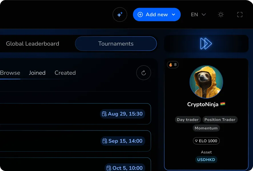 FXR Battles - это симулятор дневной торговли в реальном времени со встроенными соревнованиями. Это самый быстрый способ потренироваться под давлением, протестировать стратегии и доказать свою последовательность.